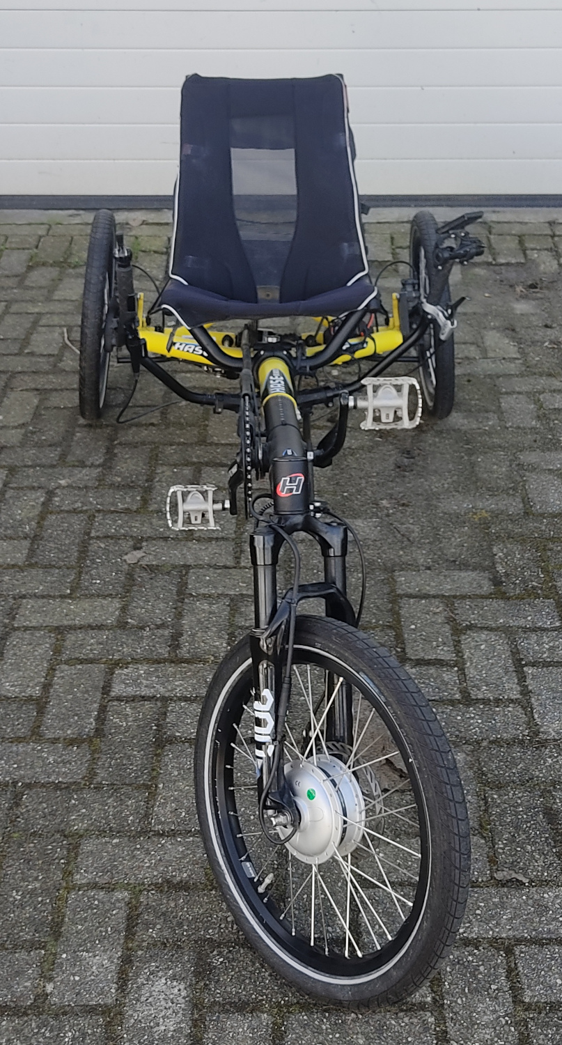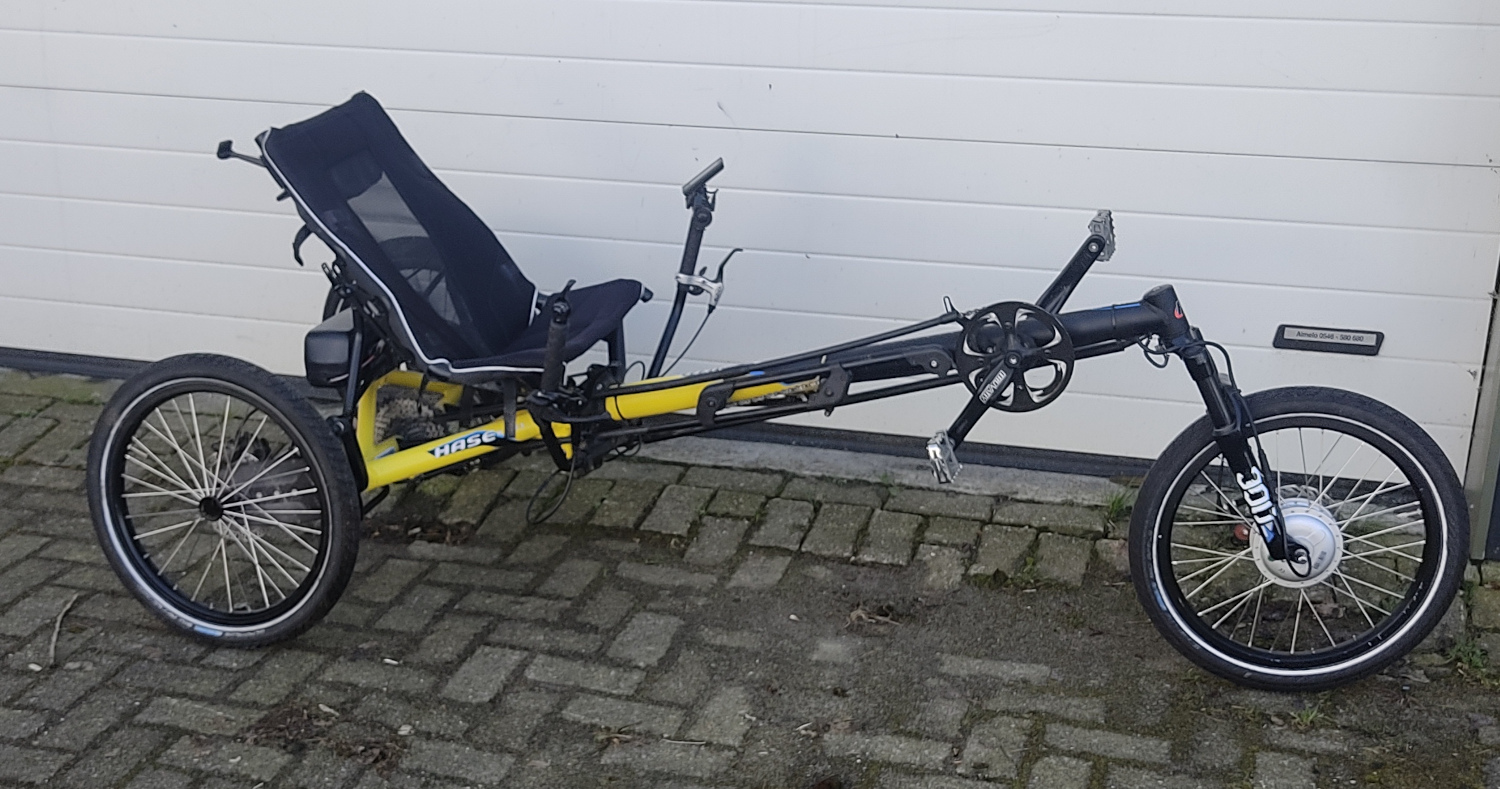 Wil je lekker crossen door de bossen dan is deze Hase Kettwiesel cross de fiets voor jouw. Met zijn voor en achtervering is hij super comfortabel. De motor in het voorwiel helpt je ook de grootste heuvels te overwinnen. Verder heeft hij 11 versnellingen en is aangedreven op beide wielen met een differentieel. Hij heeft 2 accu’s en een speciale pomp voor de dempers achter. Uiteraard is hij helemaal nagezien en krijg je een half jaar garantie op deze mooie ligfiets
